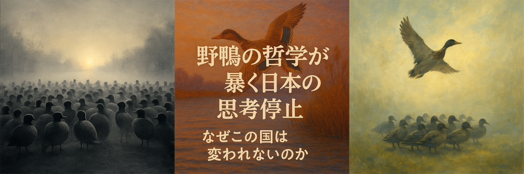 この三層が重なったとき、日本社会は個人レベルでも集団レベルでも「思考が機能しない」状態に陥る。つまり、衰退は能力の低下で起こるのではなく、思考の停止によって進行するのである。飛ぶ力を失った野鴨が、飛ぶ必要すら考えなくなるように。